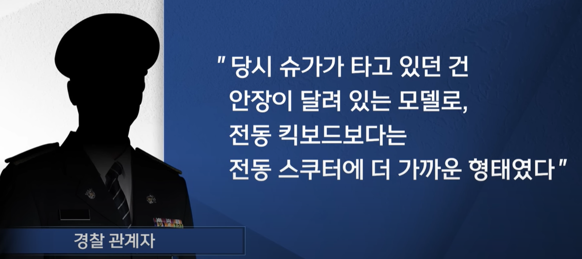 하지만 JTBC 사건반장에서 공개한 CCTV 영상에 따르면, 슈가가 타고 있던 것은 최대 시속 30km인 전동 스쿠터였습니다. 전동 스쿠터는 법적으로 원동기장치자전거로 분류되는데 전동 킥보드를 타고 음주운전을 할 경우 면허 취소와 함께10만 원의 벌칙금이 부과됩니다