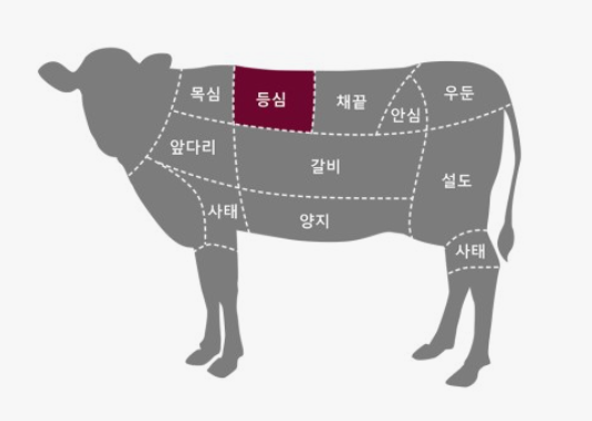 - 등심의 뒷부분으로 살코기가 많고 적당한 마블링이 있음