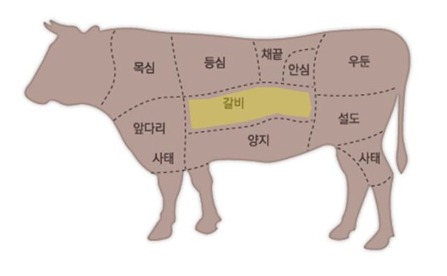 - 갈비 중앙부위, 마블링이 우수하며, 갈비부위 중 가장 맛이 좋아 구이로 즐겨 먹음