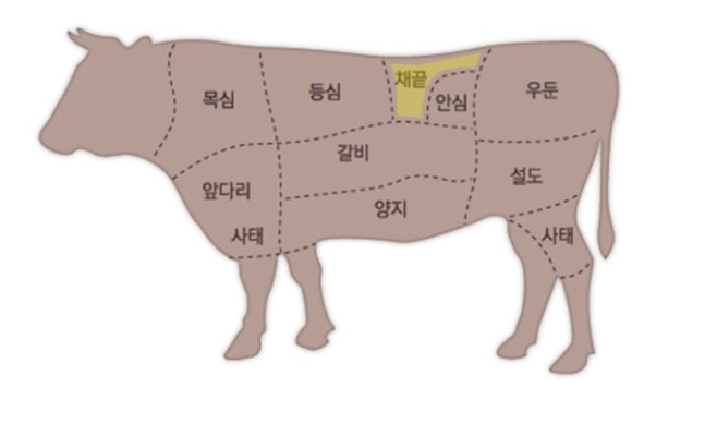 - 양지머리에 붙은 희고 단단한 부위로, 구우면 바로 익기 때문에 에 구이, 샤브샤브 용으로 사용한다.