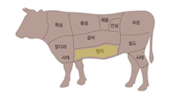 - 특징: 지방이 거의 없고, 질기다. 오랜시간 조리하면 국물 맛이 좋다. 부위에 따라 양지머리, 업진살, 치마양지 그리고 치마살로 구분한다.